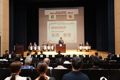 川畑鉄平副実行委員長による開会宣言で開会式が始まり、友岡善信実行委員長から開催地挨拶、川下勝利全私保連会長、伊藤悟全私保連青年会議会長から主催挨拶がなされました。来賓挨拶では、安田壮平様(奄美市長)、中西淳也様(日本保育協会青年部部長)よりご挨拶をいただきました。